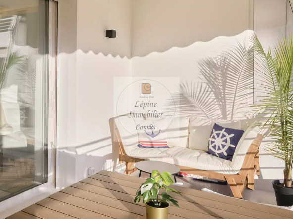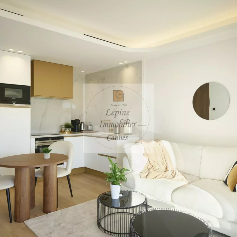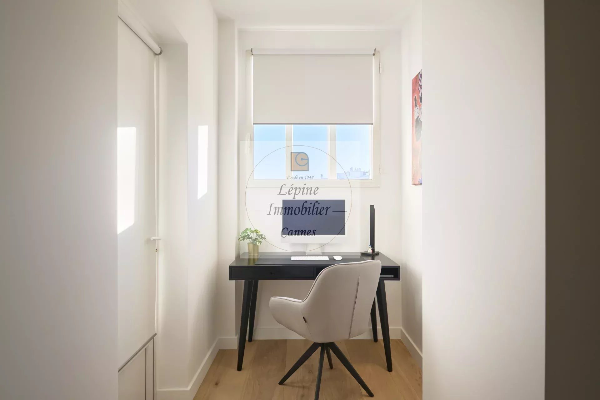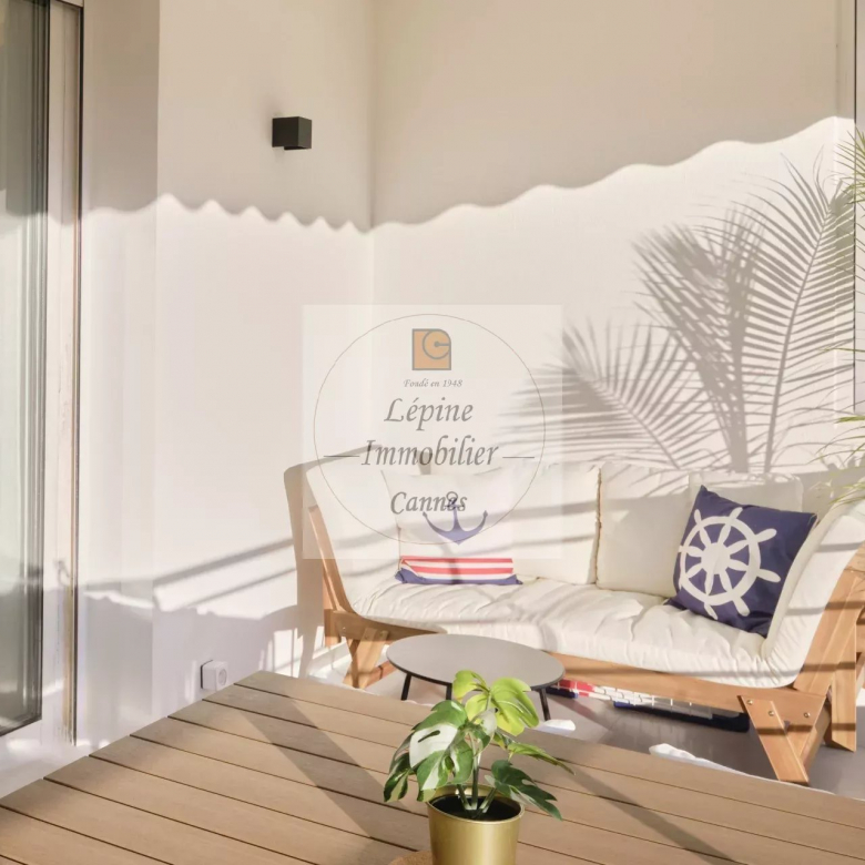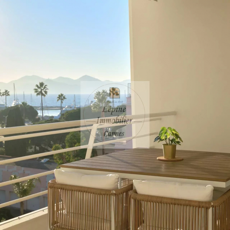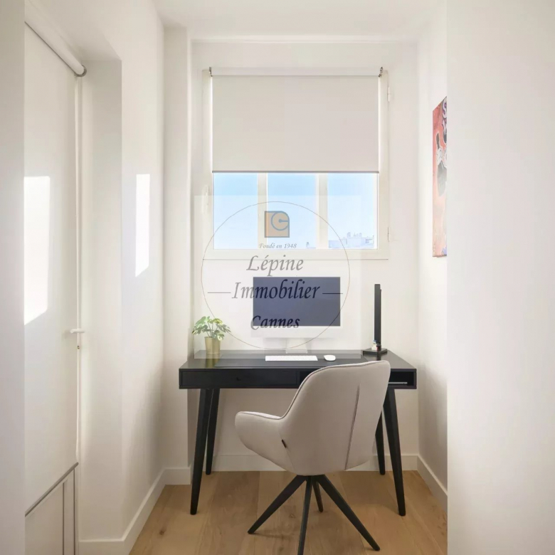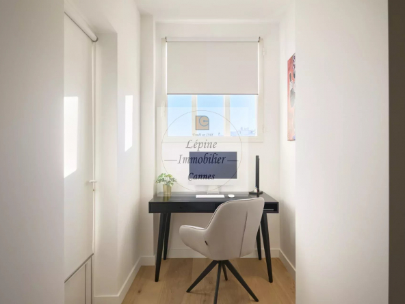 Situato al 4° piano, l’appartamento gode di un’esposizione a sud e di una vista sul mare, su Port Canto e sul Massiccio dell’Estérel. Un’ampia e tranquilla terrazza di 11 m² ospita un soggiorno con cucina completamente attrezzata, una camera da letto, una terrazza, un bagno con doccia, un WC sospeso, un ripostiglio e una zona ufficio.