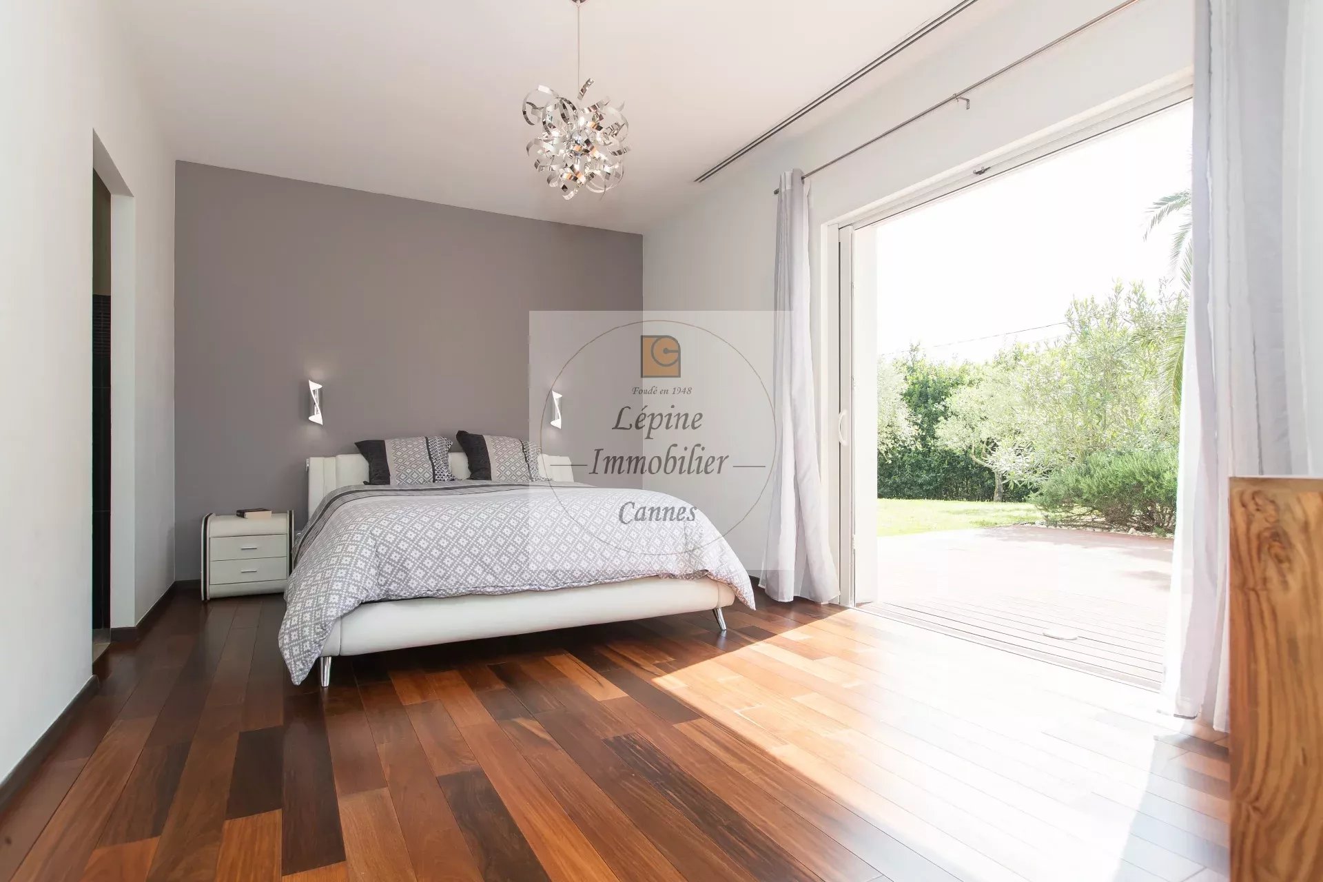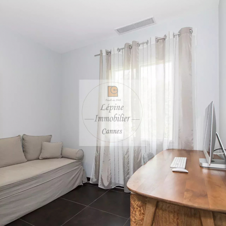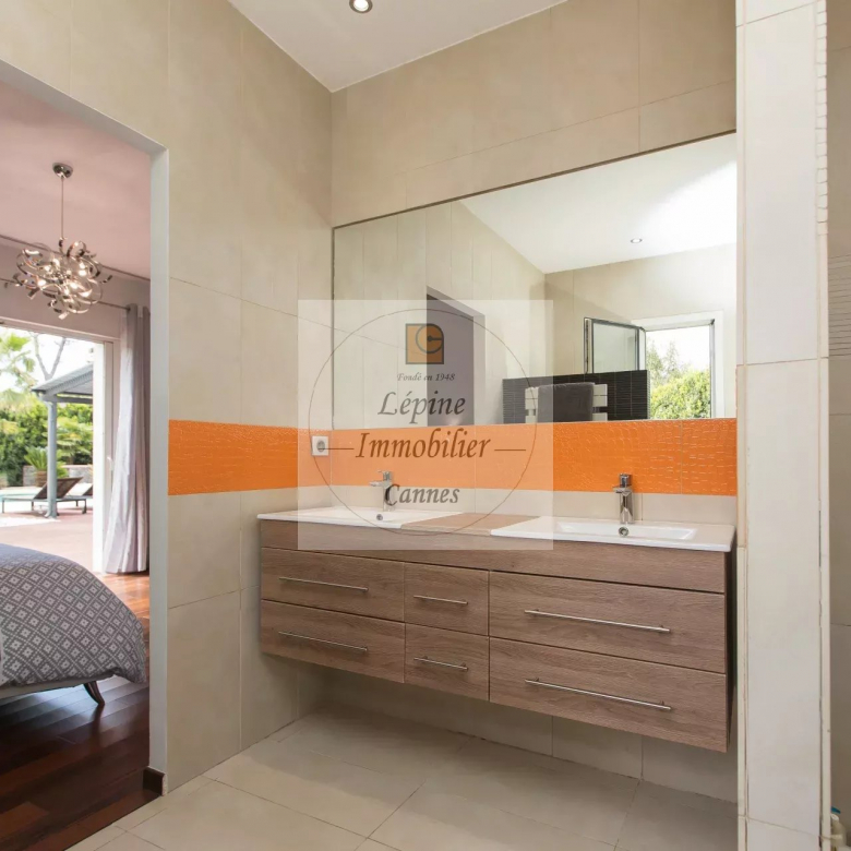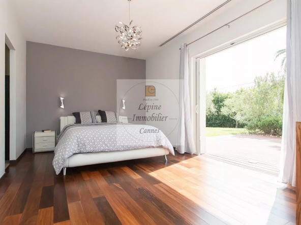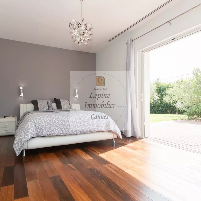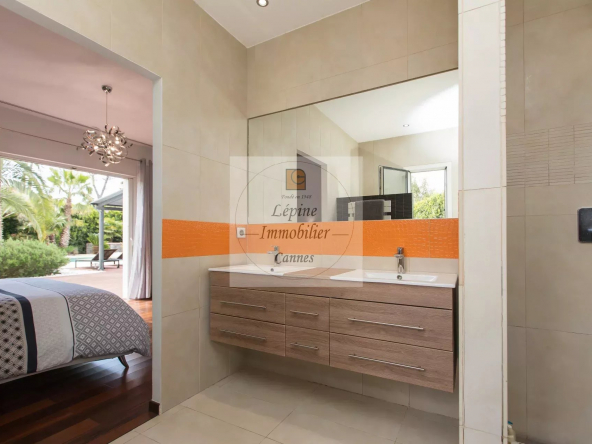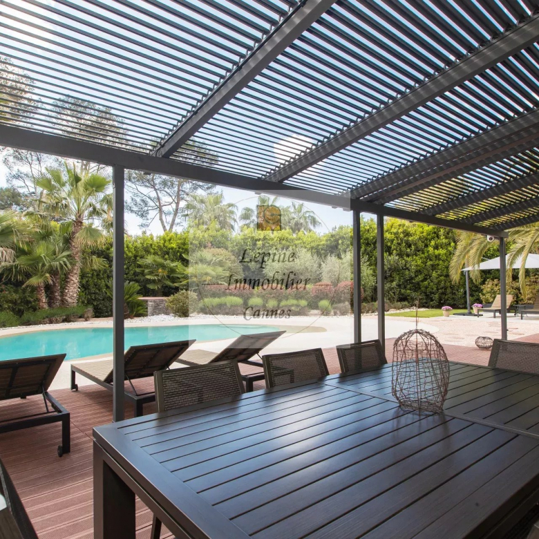 MOUGINS : Située dans un quartier résidentiel de MOUGINS, à quelques minutes de CANNES et à proximité de l’étang de FONTMERLE, Superbe villa de plain-pied à l’architecture moderne et épurée sur terrain plat de 2416 m².