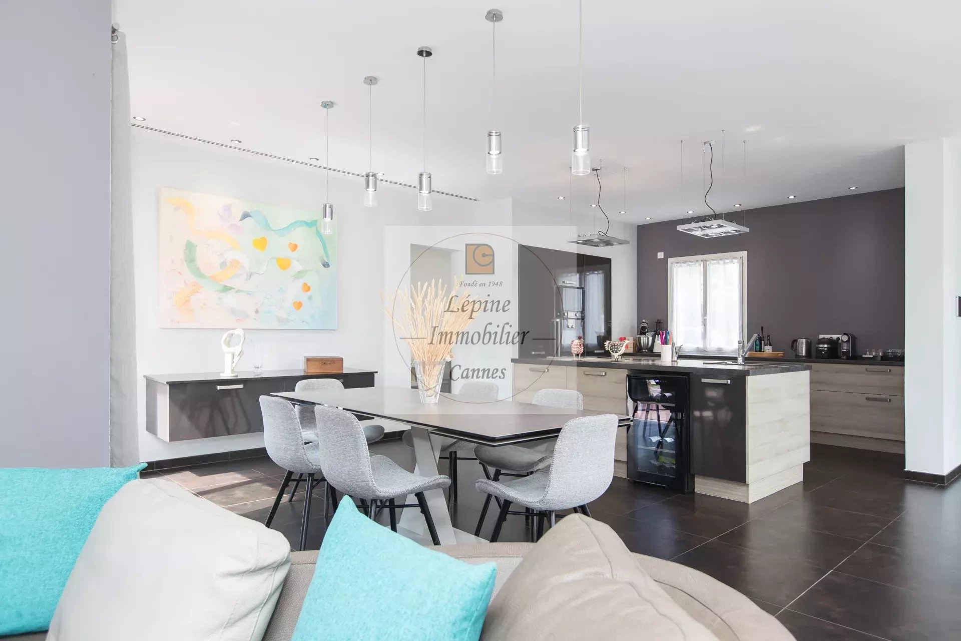 Le spacieux séjour est agrémenté d’un chaleureux coin cheminée (parfait pour vos soirées d’hiver), et s’ouvre sur une cuisine contemporaine entièrement équipée.