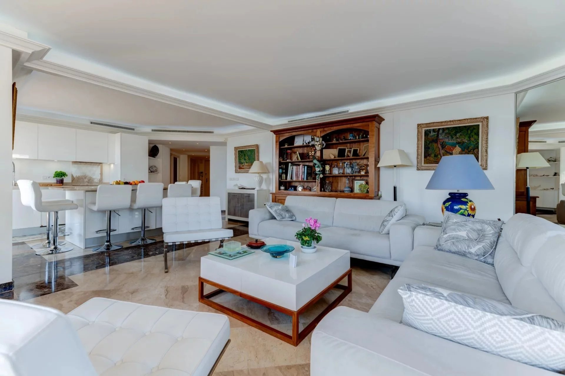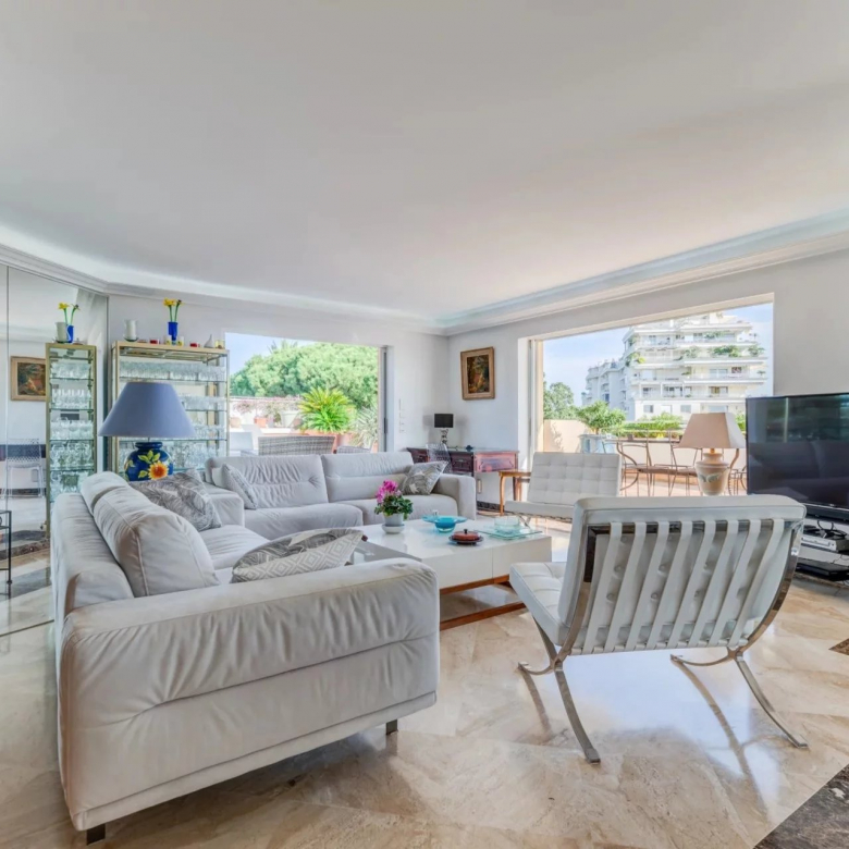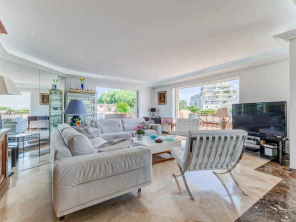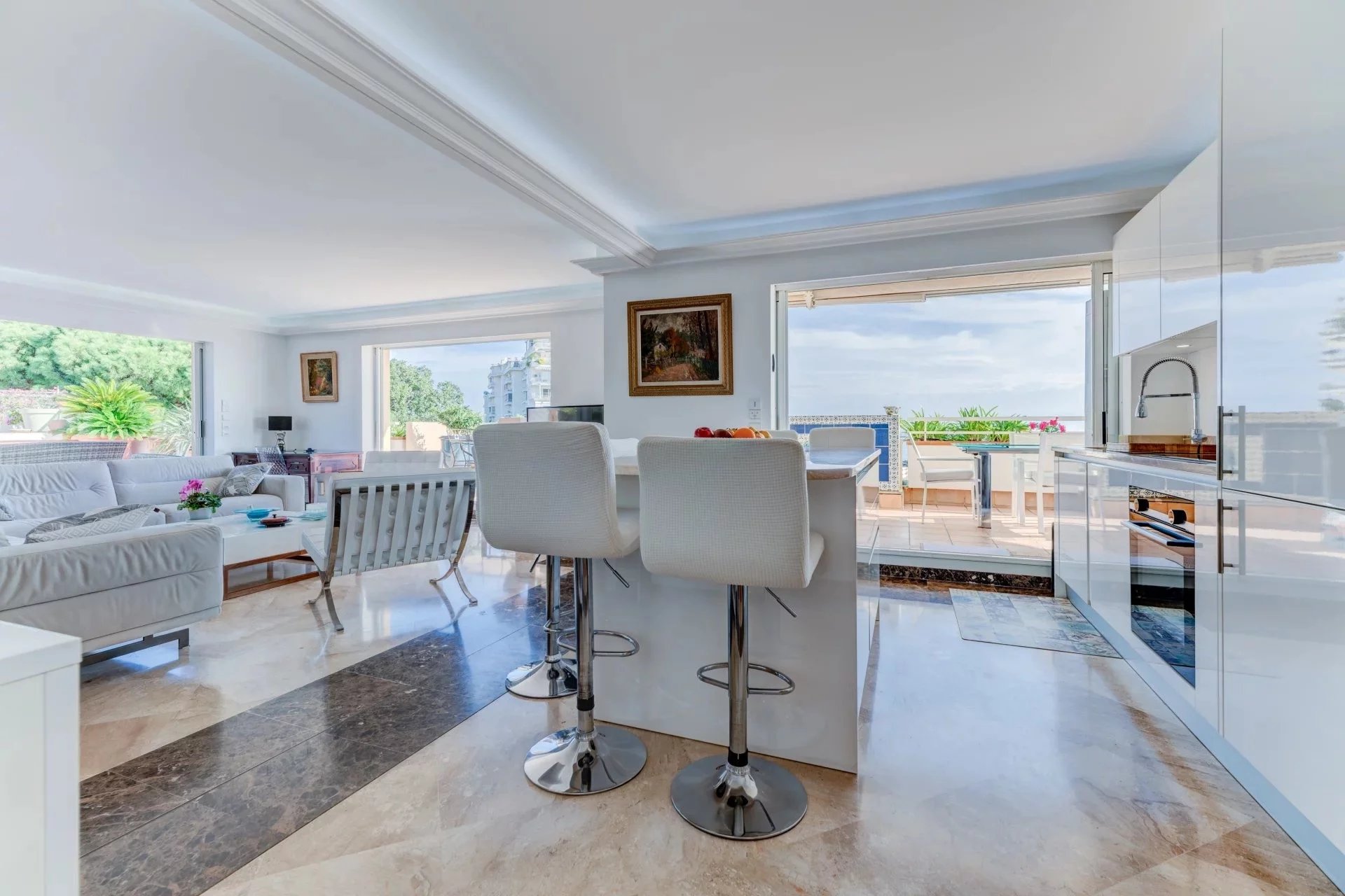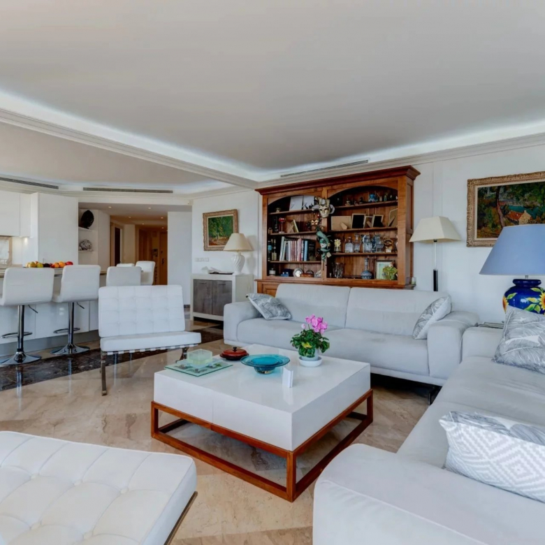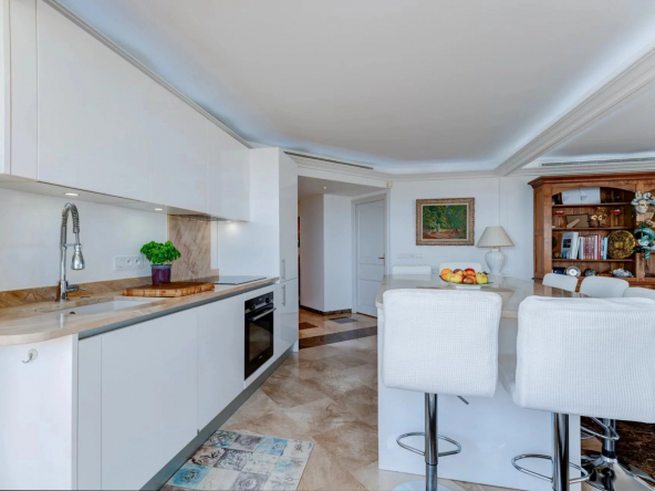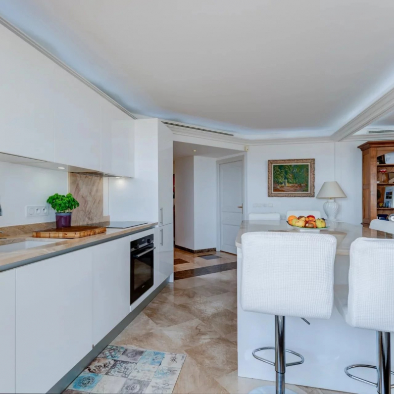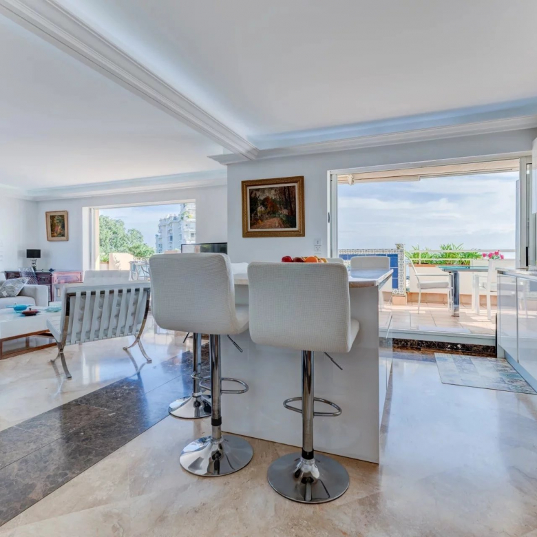 L’appartement s’organise autour d’un séjour spacieux de 49 m², baigné de lumière grâce à de larges baies vitrées à galandage, ouvrant pleinement l’espace sur l’extérieur. La cuisine ouverte, parfaitement intégrée, crée un ensemble convivial et contemporain, idéal pour recevoir face à la Méditerranée.