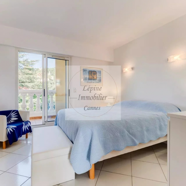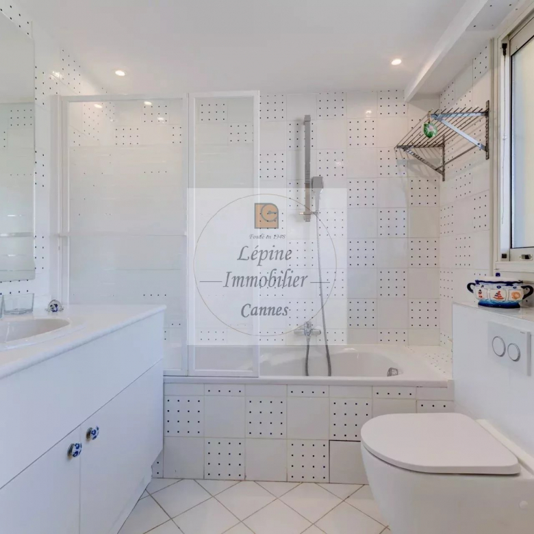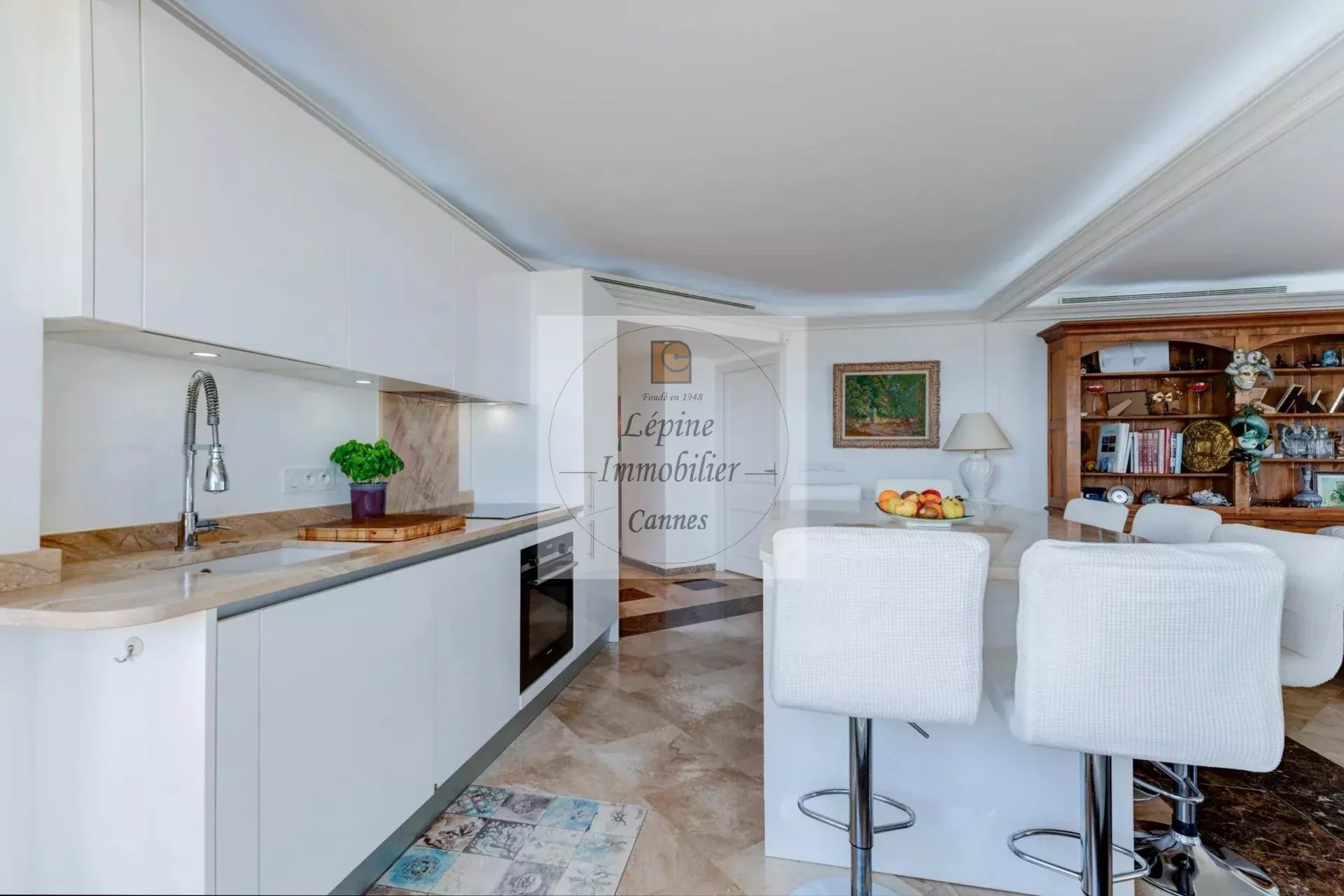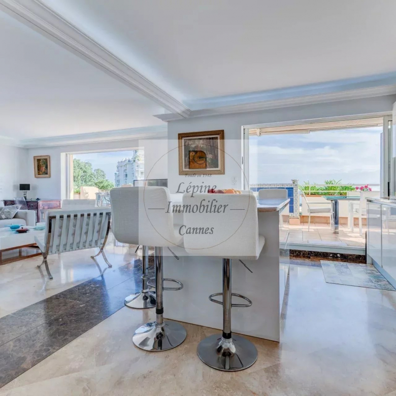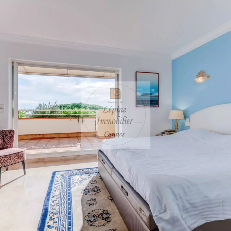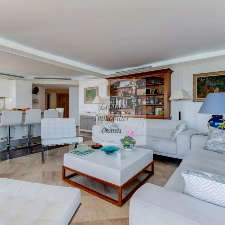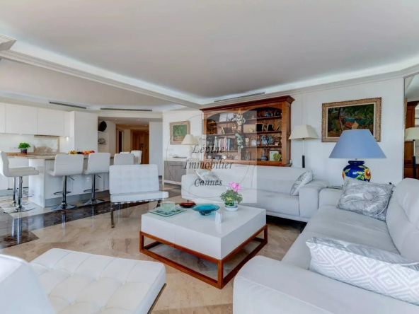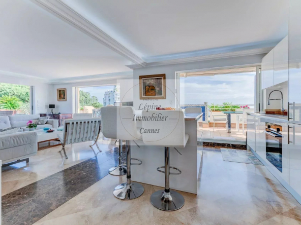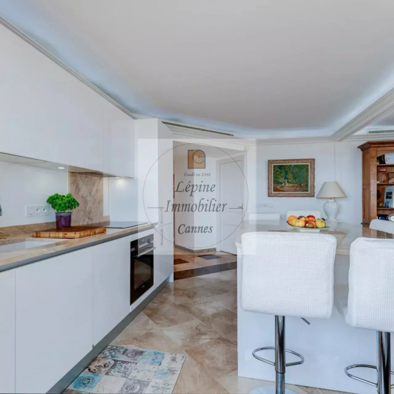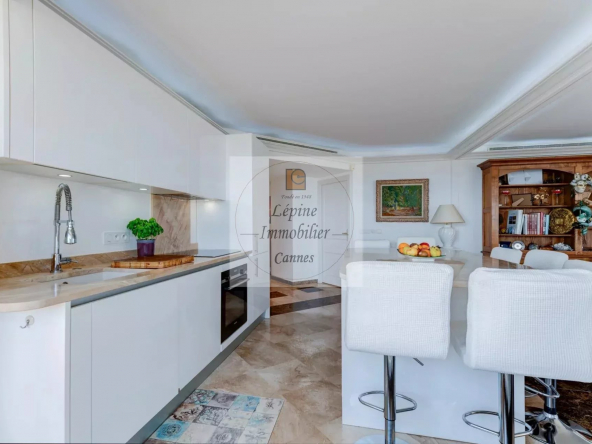 L’appartement s’organise autour d’un séjour spacieux de 49 m², baigné de lumière grâce à de larges baies vitrées à galandage, ouvrant pleinement l’espace sur l’extérieur. La cuisine ouverte, parfaitement intégrée, crée un ensemble convivial et contemporain, idéal pour recevoir face à la Méditerranée.